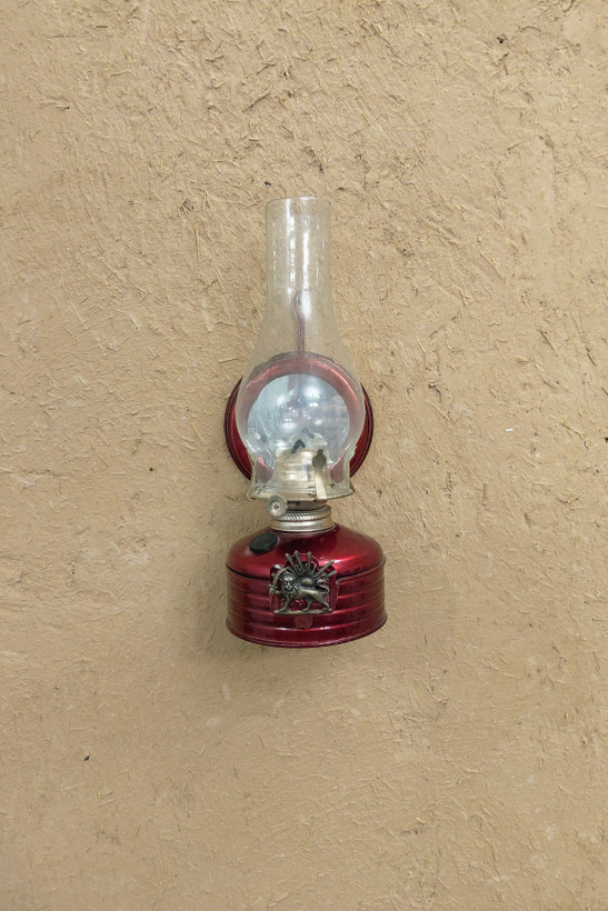 چراغ نفتی طرح قدیم دیواری، سالم و قابل استفاده، فلزی و رنگ شده به رنگ سرخ.